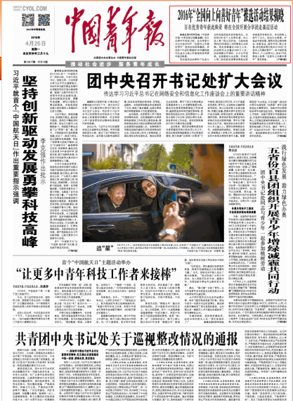 图为:《中国青年报》头版报道2016年“全国向上向善好青年”活动