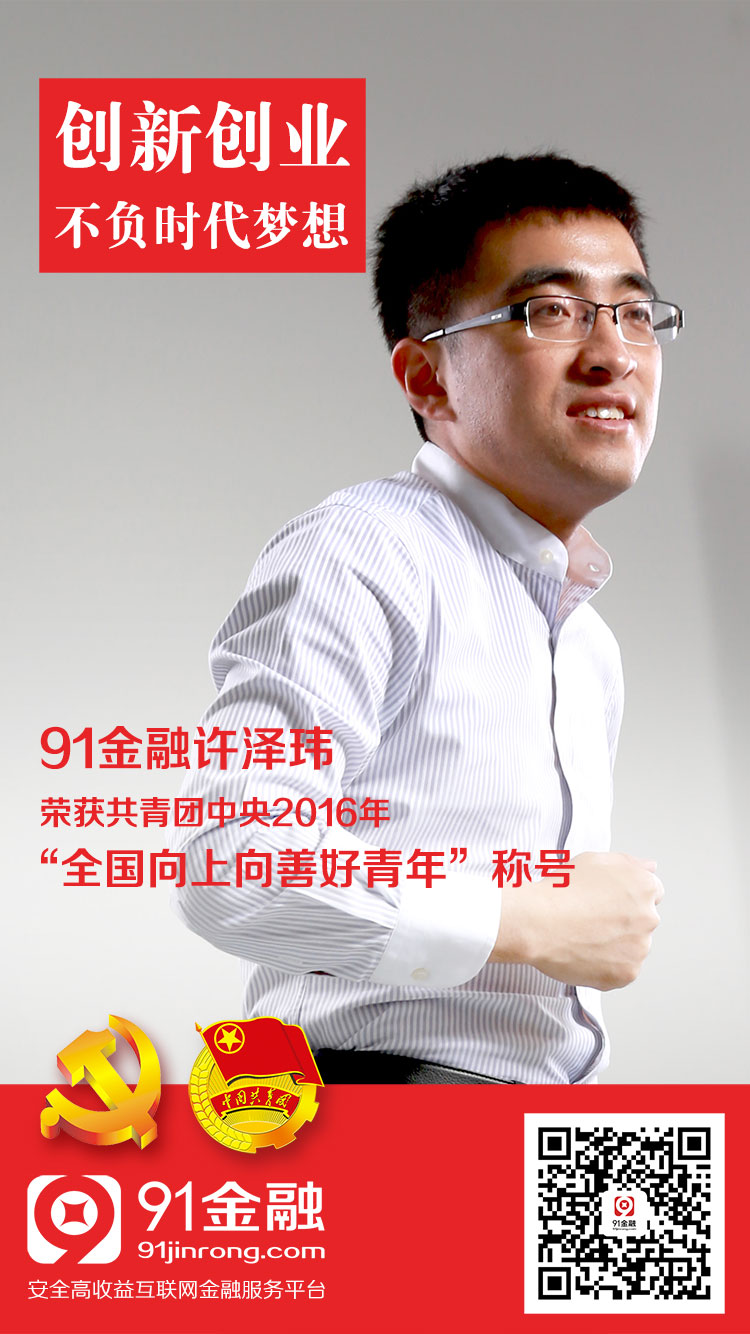 在共青团中央主办的2016年“全国向上向善好青年”推选活动中,公司2002级杰出员工、91金融创始人、董事长、CEO许泽玮与来自全国各个行业和领域的100名模范践行社会主义核心价值观的优秀青年获此殊荣。91金融许泽玮作为全国数以千万的创业青年代表,以及互联网金融领域的创业者,荣获“创新创业好青年”称号。