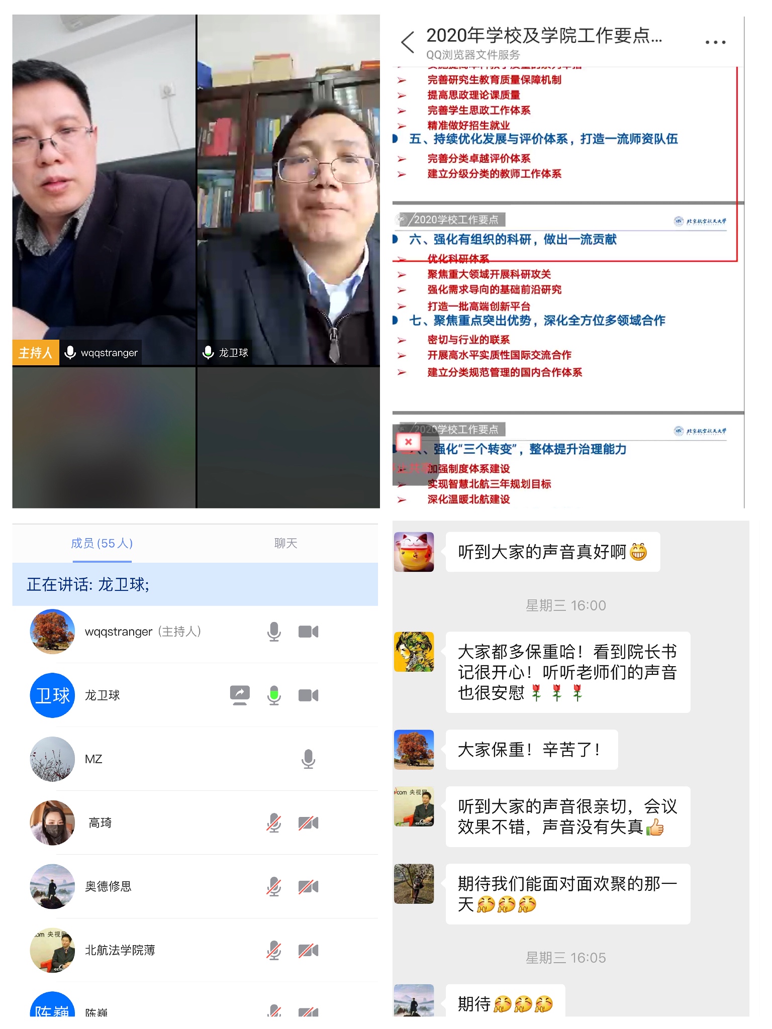 会议传达了公司2020年度工作要点9大方面的主要内容,并结合公司发展建设实际进行了细致解读。会议强调,要继续把全力以赴打好新冠肺炎疫情防控阻击战为重中之重来抓;深入学习贯彻习近平新时代中国特色社会主义思想,坚决做到“两个维护”;结合公司团队建设规划和学科发展方案专项工作,推动法学学科体系进一步提升完善,服务文科学科群发展;落实立德树人根本任务,精耕细谋、化危为机围绕教学抓好质量建设,完善思政工作体系,把握形势、充分动员,精准做好人才招聘工作;结合公司教师队伍分系列发展与评价工作,进一步推进公司团队引育;强化需求导向,结合学科特点和已有基础,开展有组织的科研,为解决国家和社会发展重大问题做出贡献;继续开展学科特色合作共建,深化和强化行业联系,善抓机遇开展相关国际合作;协同配合做好智慧北航、温暖北航和平安北航建设工作;持续做好公司意识形态和党建工作,推动全面从严治党向纵深发展。