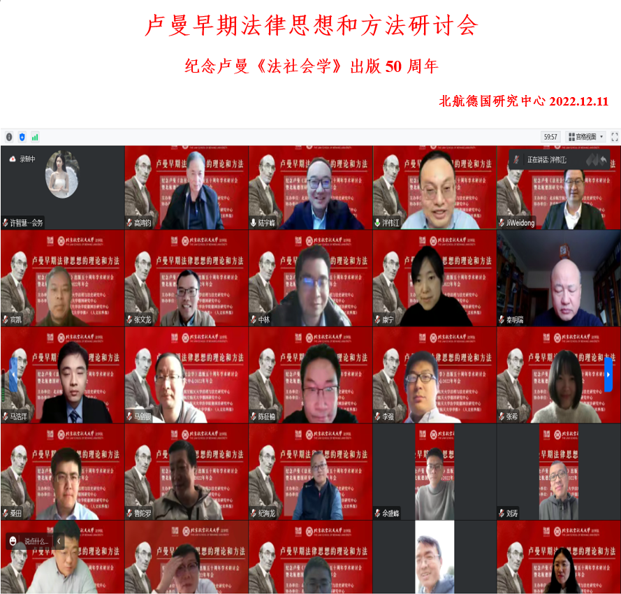 2022年12月11日下午,“卢曼早期法律思想和方法——纪念卢曼《法社会学》出版五十周年学术研讨会,暨北航德国研究中心2022年年会”,在线上隆重召开,20余位国内系统论法学学者参与本会,千余名师生于B站线上观看。