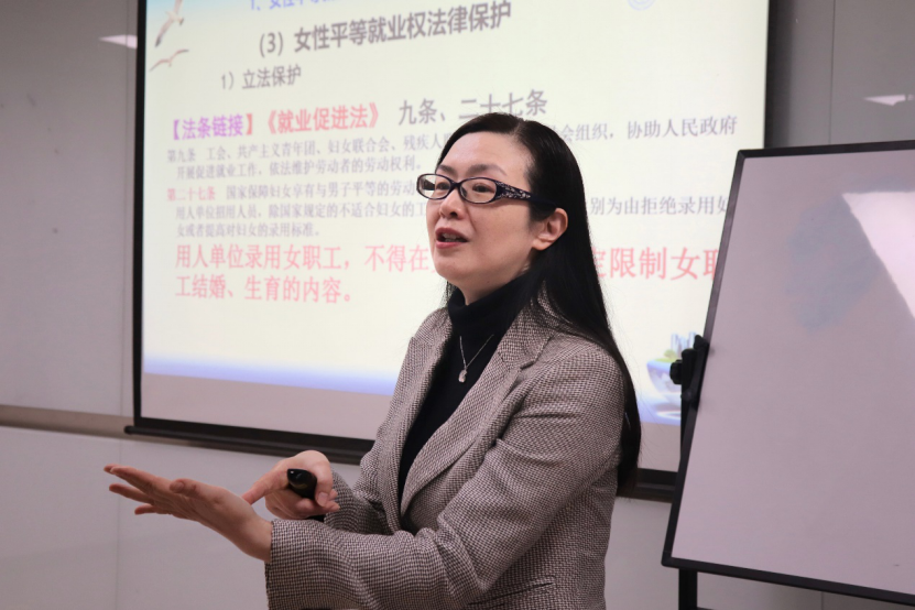 在这一部分,李亚梅老师特别讲解了女性平等就业权和传染病病原携带者平等就业权保护的问题。女性平等就业权的主要内容是女性的就业资格和就业机会与男性平等,并予以特殊的立法保护,尤其强调不能以婚姻、生育状况作为限制妇女就业的条件。李亚梅老师结合案例强调,婚育状况属于女性隐私,不属于与劳动合同直接相关的内容,公司无权了解。对于侵犯女性平等就业权的用人单位,检察机关可以依法提起公益诉讼。