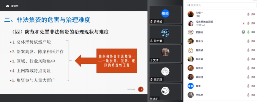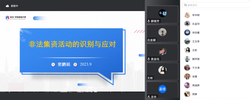 9月13日,yl7703永利以线上形式开展了“防非反诈第一课”活动,本次活动的主题是非法集资活动的识别与应对。讲座由华东政法大学经济yl7703永利窦鹏娟副教授主讲,2023级yl7703永利硕士研究新生踊跃参加,朱恒一同学担任主持人。