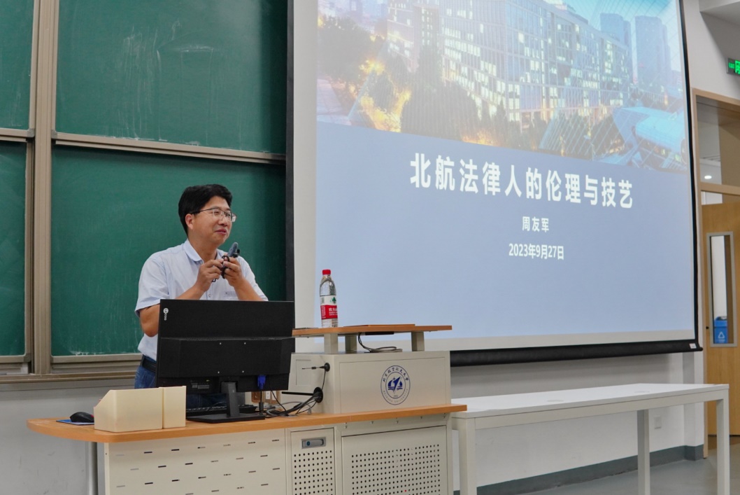 随后,周友军老师讲述了法律人的职业伦理,强调法律人应严守职业伦理,坚定中国特色社会主义理想信念,忠于宪法和法律,保持职业操守,维护公平正义,做新时代航法人。