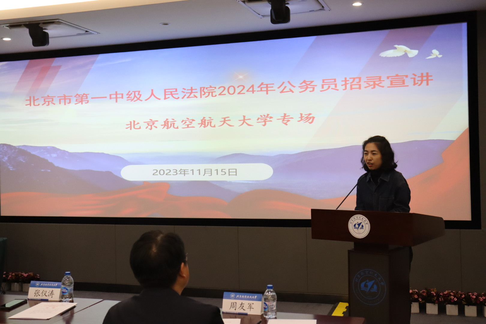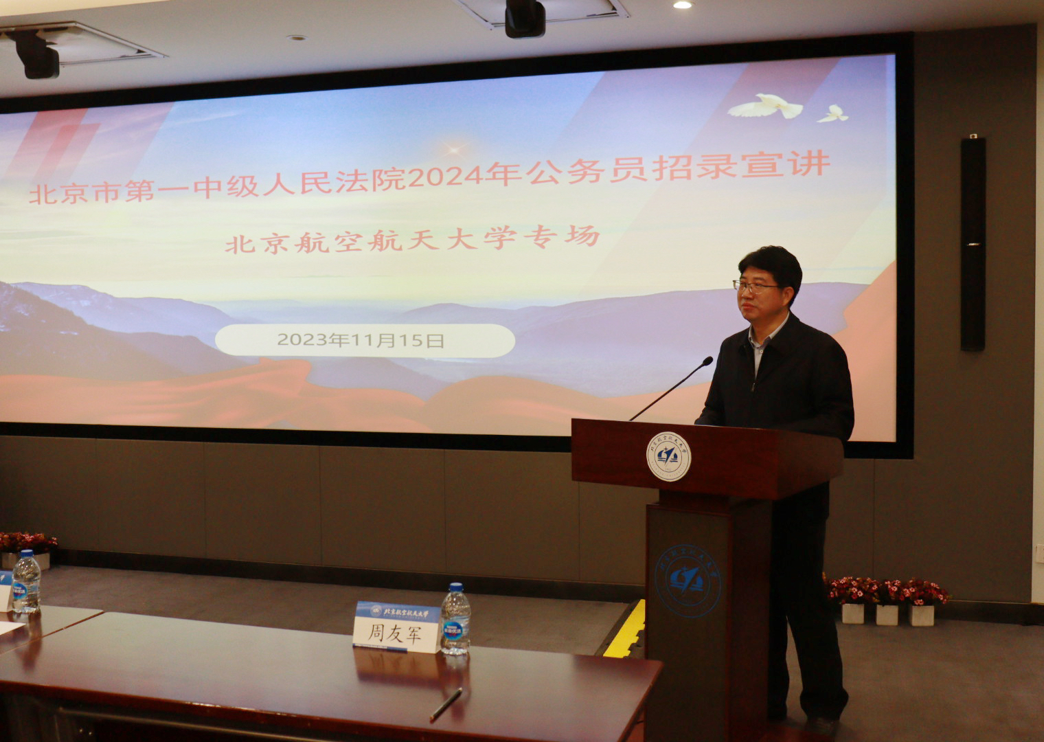 为深入学习贯彻党的二十大精神,鼓励法学专业毕业生到人民法院施展才干、建功立业,11月15日上午,北京市第一中级人民法院到北航开展公务员招录宣讲,会议在如心会议中心中报告厅举行。北京市第一中级人民法公司党组成员、政治部主任张仪涛,干部处副处长杨卫军,清算与破产审判庭干部刘琦,干部处干部陈震参加宣讲。公司员工工作部部长宋晓东,公司党委书记周友军,公司党委副书记邹沛东出席,yl7703永利应届毕业生踊跃参加。