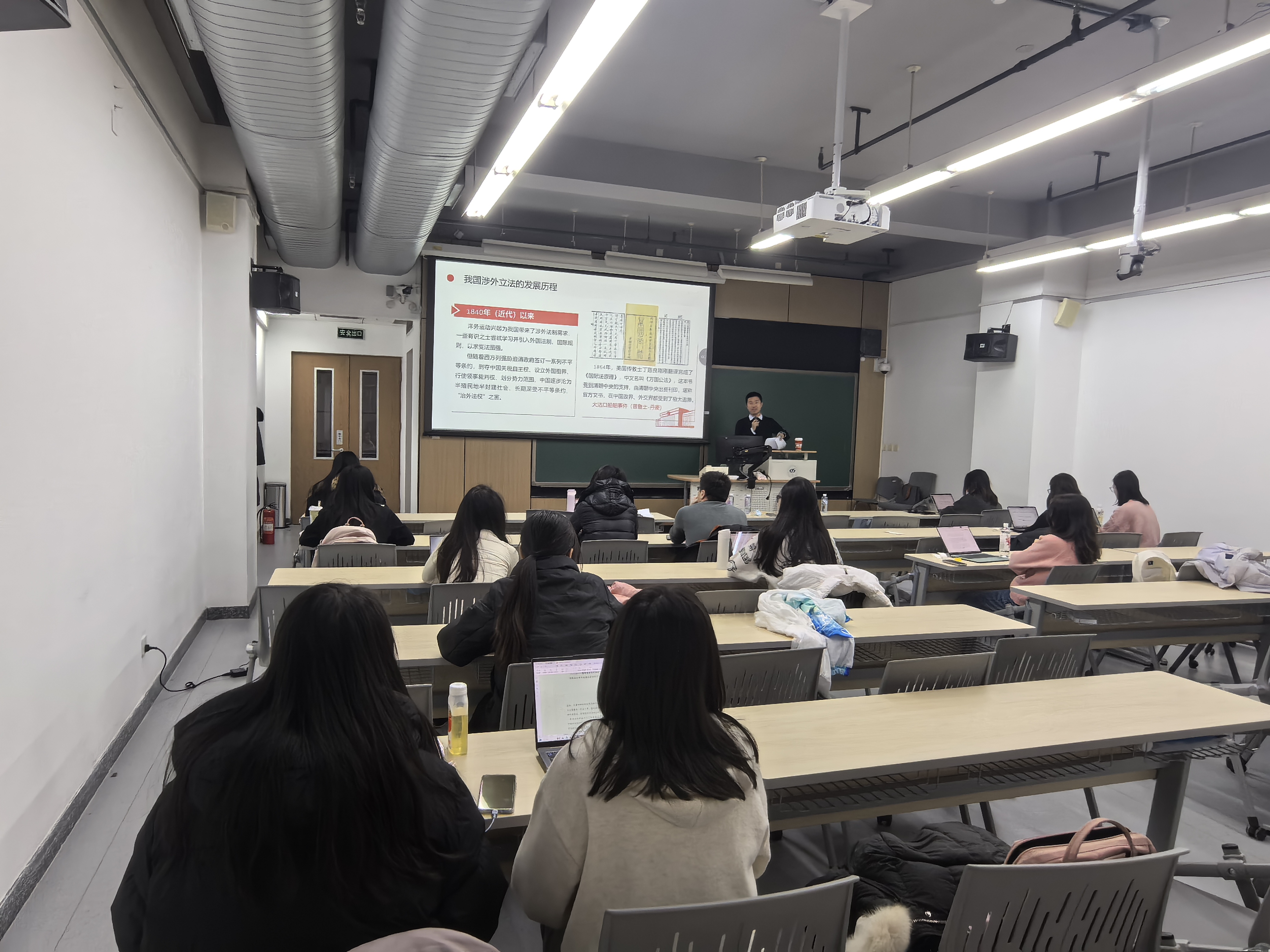 讲座过程中,唐亚老师首先就“国内法治”“涉外法治”“国际法治”的内涵和外延作了阐释,强调“涉外法治”是调整涉外法律关系的理念、原则、制度、机制、规则、活动的总称和集合,是中国特色社会主义法治体系的重要组成部分,指出“涉外法制”是指“涉外法律和制度”,属于制度规范层面,其建设的目标是构建系统完备的涉外法律法规体系。然后,唐亚老师从“古今中外”四个维度全面系统地介绍了我国的涉外法制的有关情况:一是,回顾了我国涉外立法发展历程,即从近代萌生涉外法制建设需求,到新中国成立初期涉外法制奠定基础,到改革开放以来“外资三法”出台及加入世界贸易组织后我国涉外法律法规体系全面接轨国际规则,直至党的十八大以来,我国涉外立法的深度、广度大幅拓展和加强。二是,介绍了当前我国涉外法律法规体系建设取得的成效作用,指出涉外法制在保障并持续推进对外开放、促进对外交流交往、维护国家主权安全与发展利益等方面起到了重要作用,还重点介绍了反外国制裁法、对外关系法的有关内容和制度设计。三是,对当前国际领域涉外法治的斗争情况作了梳理分析,指出域外立法实践及国际法领域斗争为我国推进涉外法治建设提供了有益借鉴。四是,展望了我国涉外立法的发展方向,提出应当加强系统规划,积极推进海洋、太空、极地等新兴领域立法,进一步推动国内法与国际法的融会贯通,拓展涉外法治理论和实践研究的深度和广度,着重培养熟悉中国法、国际法、外国法的复合型涉外法治人才。此外,唐亚老师还分享了立法工作中的一些体会和认识,与会同学们作了互动交流。