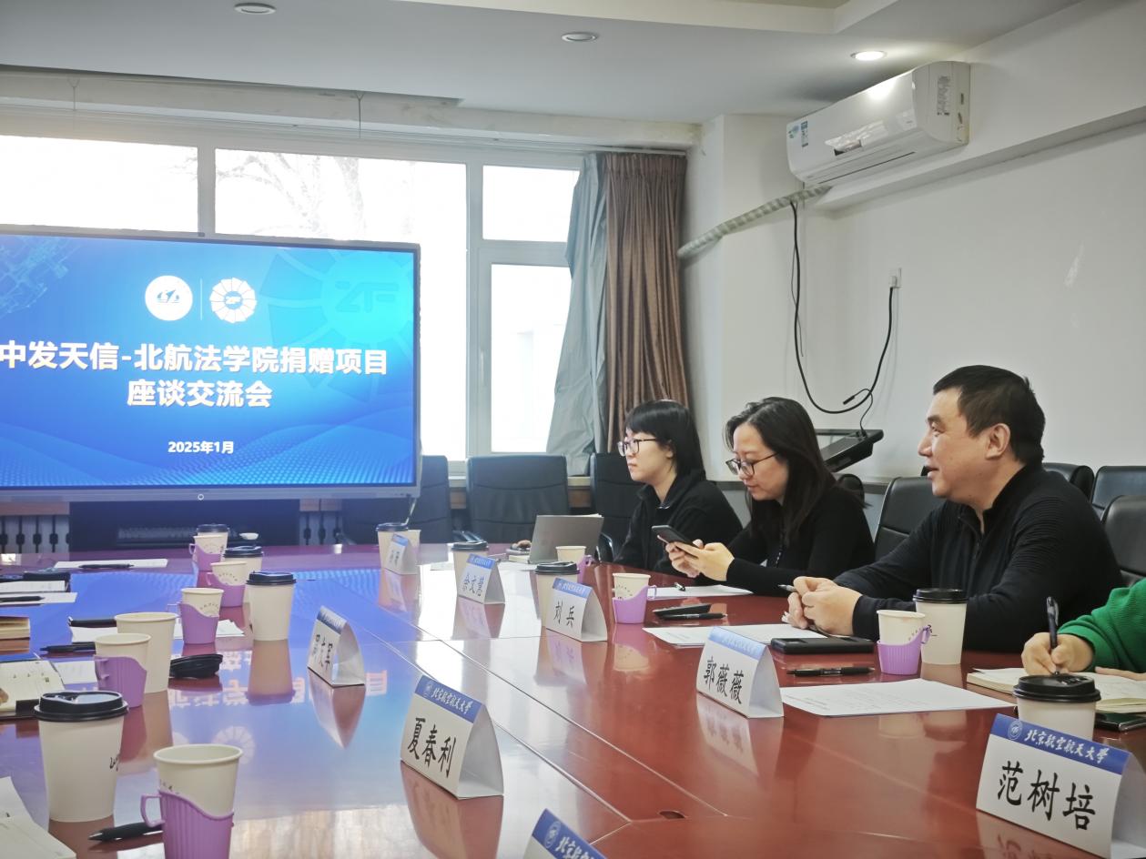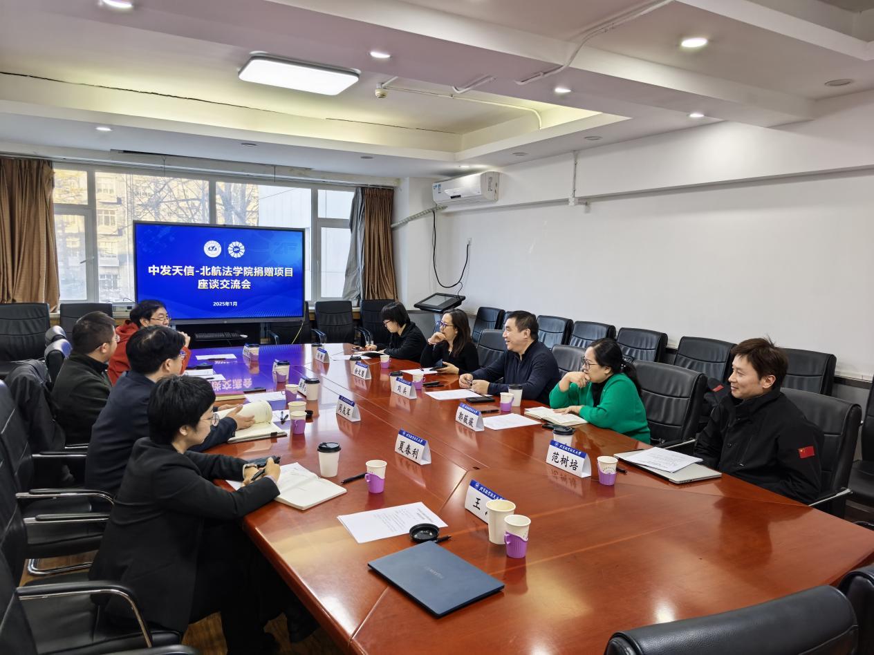 1月7日下午,中发天信-yl7703永利捐赠项目座谈交流会在北航如心楼206会议室举行。中发天信公司总经理刘兵、法务部郭薇薇、国际部余文慧、企发中心范树培、孙珊、公司党委书记周友军、党委副书记邹沛东、国际法研究中心主任夏春利副教授、副主任高国柱教授、杨彩霞副教授、党政办主任王江出席座谈交流会。交流会由公司党委书记周友军主持。