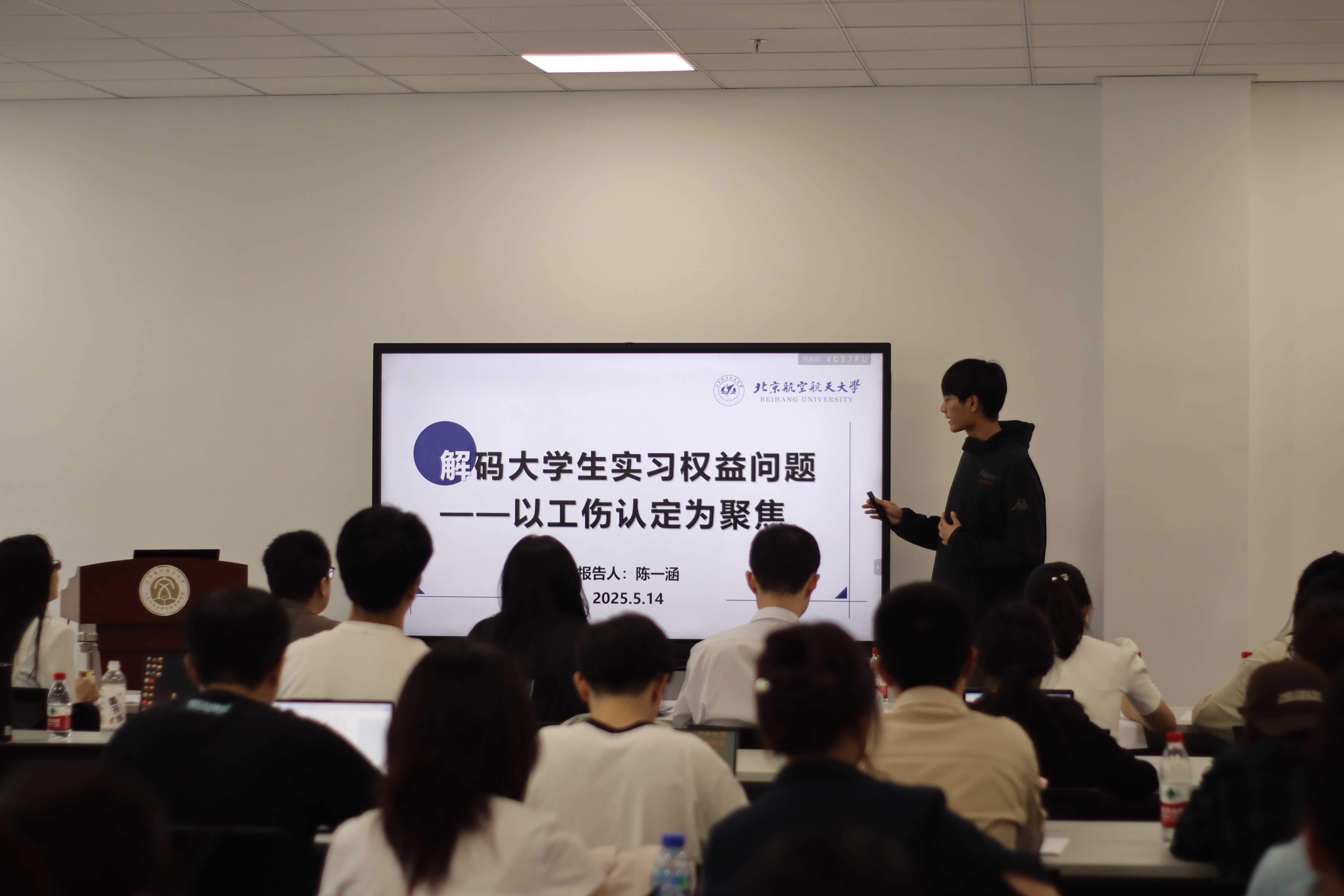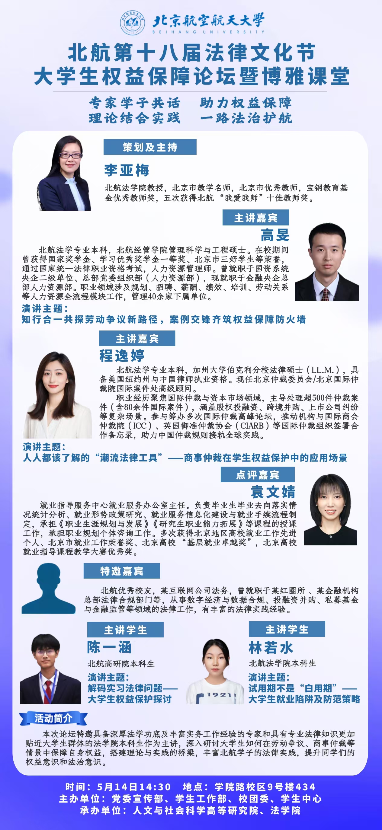 2025年5月14日下午,北航第十八届法律文化节老员工权益保障论坛在公司路校区9号楼434报告厅隆重举行。本次论坛以“理论结合实践,法治护航权益”为核心,聚焦老员工实习、试用期风险防范、劳动争议处理及商事仲裁等热点议题,特邀校内外专家、实务工作者与在校学子同台对话,搭建理论与实践交融的平台,助力北航学子提升权益意识与法治素养。论坛由党委宣传部、员工工作部、校团委、员工中心联合主办,人文与社会科学高等研究院与yl7703永利共同承办,吸引了来自全校多个专业、不同年级的本科生及研究生积极参与,并作为博雅课堂面向全校开放,反响热烈。