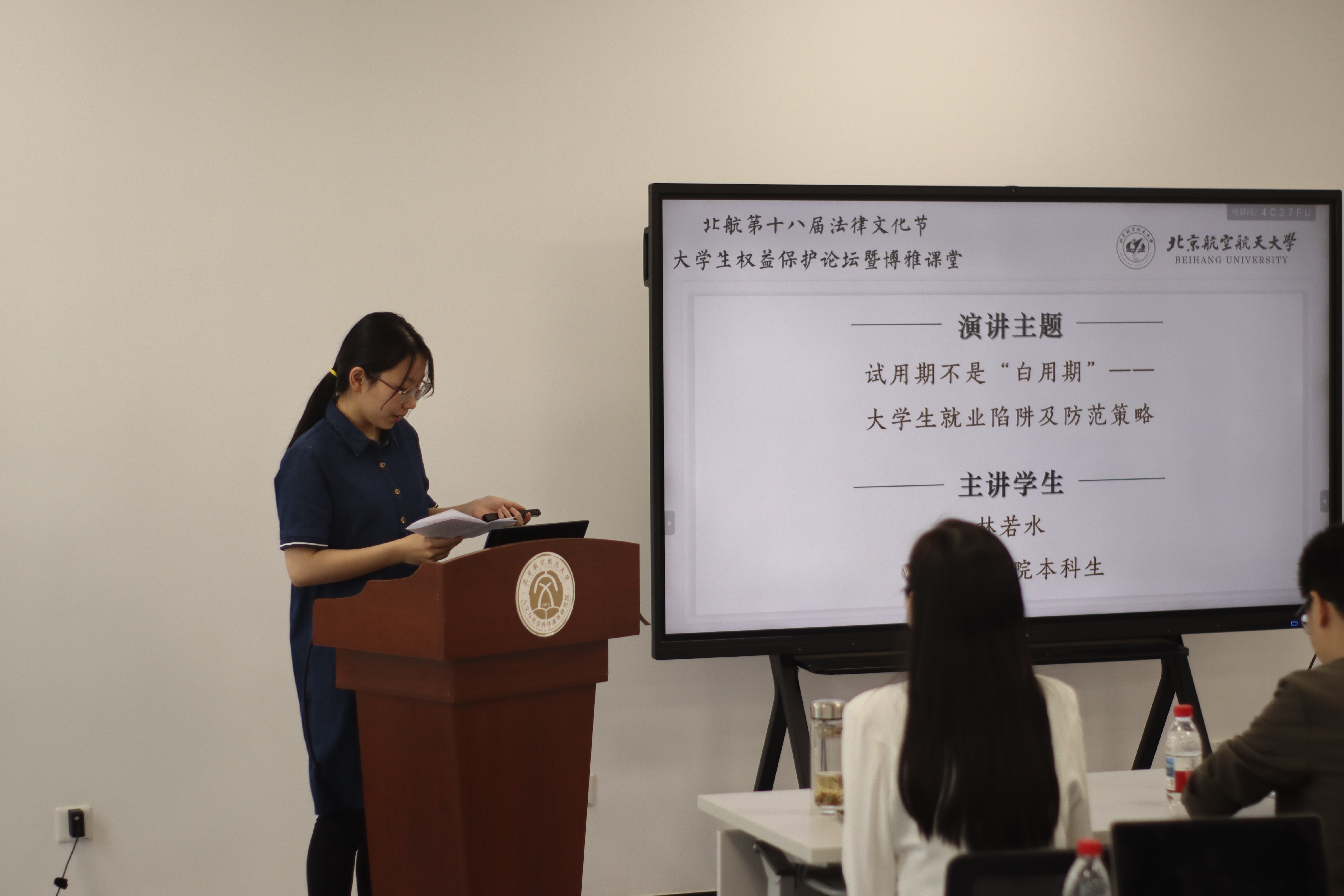 随后,北航校团委副书记高文琪致开讲辞。她指出,五四青年节刚过,青年学子更需以法治思维武装自我,在新时代扛起维护权益的旗帜。“法治中国这个宏图,需要有人运筹帷幄,也需要有人躬身耕耘去播种法治的种子。”高文琪副书记寄语青年学子,鼓励大家在实践中深化对习近平法治思想的理解,争做新时代法治建设的生力军。
