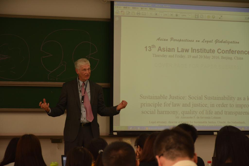 在本次讲座的开始,他以于1972年发生在自己所诉讼代理的真实案例为引子,阐述了自己“Sustainable Justice”这一想法诞生的原因。在之后的数十年的时间里,Alexander教授仍孜孜以求、不断探索。在2007-2008年里的一次去澳大利亚、新西兰以及美国的学术出访期间,他开始接触到一些专门解决相关问题的法院,并发现当地文化中的正义的形式体现出了可持续性价值的整合。他发现,在一个社会中,法院有潜力成为对于社会可持续发展的追求的催化剂。并且他认为,从法律和正义的角度来看,以期求创建和谐社会、提高生活质量和透明度,所以社会可持续性是一个非常关键和重要的原则。