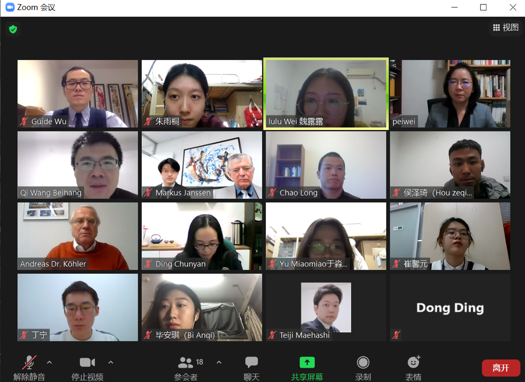 下半场会议中,公司裴炜副教授做“Right to Defense in Predicament”(“困境中的辩护权”)主题报告,科勒律师事务所Andreas Köhler博士做“Protection of Personal Information: from the Perspective of German Law”(“个人信息保护:以德国法为例”)主题报告。随后,公司正在德国访学的博士研究生龙超做“Constitutional principles of personal information protection during COVID-19 in Germany”(“德国疫情下个人信息保护的宪法原则”)主题报告,硕士研究生崔馨元做“Chinese Practice of Personal Information Protection during Epidemic Period”(“疫情期间个人信息保护的中国实践”)主题报告。