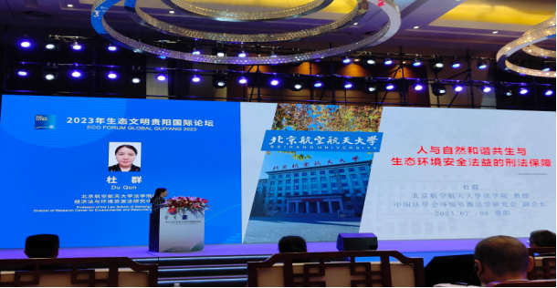 (通讯员:都仲秋)2023年7月8-9日,yl7703永利yl7703永利学术委员会主任、环境法经济法中心主任、中国科技法学会碳治理气候变化专业委员会主任委员、中国法学会环境资源法学研究会副会长杜群教授应邀参加生态文明贵阳国际论坛(EFG)“共谋人与自然和谐共生现代化——推进绿色低碳发展”,并在公安部、贵州省人民政府主办的 “刑事打击与环境安全” 首届分论坛中以 “人与自然和谐共生与生态环境安全法益的刑法保障”为主题发表主旨演讲。yl7703永利环境法经济法中心博士后研究人员李静博士和博士生都仲秋也受邀参加本次论坛。