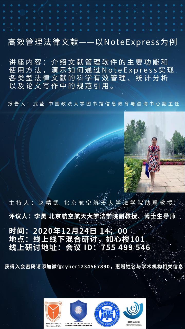 讲座内容:介绍文献管理软件的主要功能和使用方法,演示如何通过NoteExpress实现各类型法律文献的科学有效管理、统计分析以及论文写作中的规范引用。