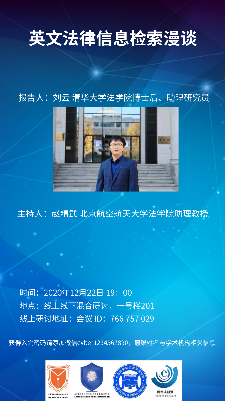时间:2020年12月22日 19:00地点:线上线下混合研讨,一号楼201线上研讨地址:会议 ID:766 757 029会议密码:123456获得入会密码请添加微信cyber1234567890,惠赠姓名与学术机构相关信息