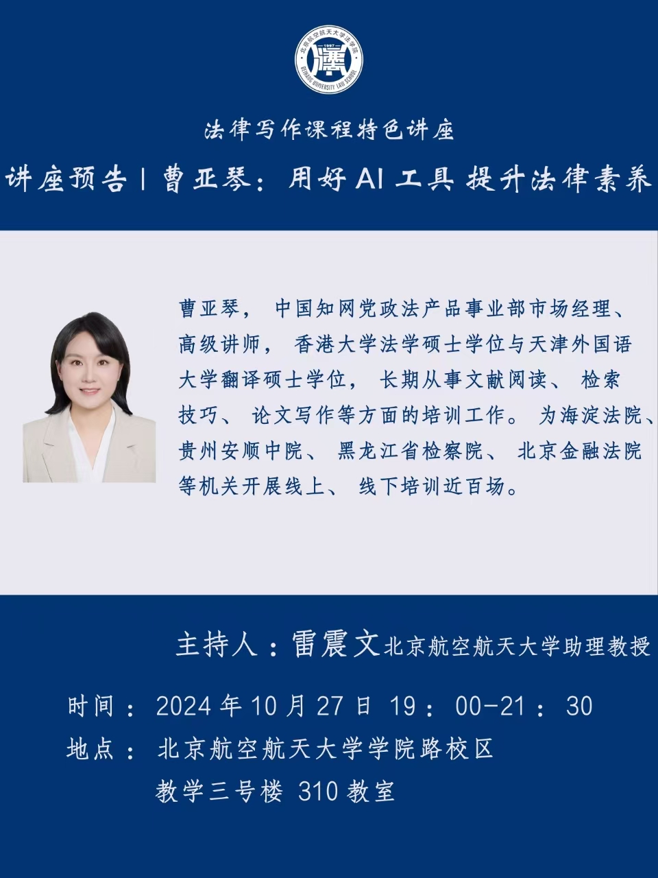 讲座预告 | 曹亚琴:用好AI工具提升法律素养