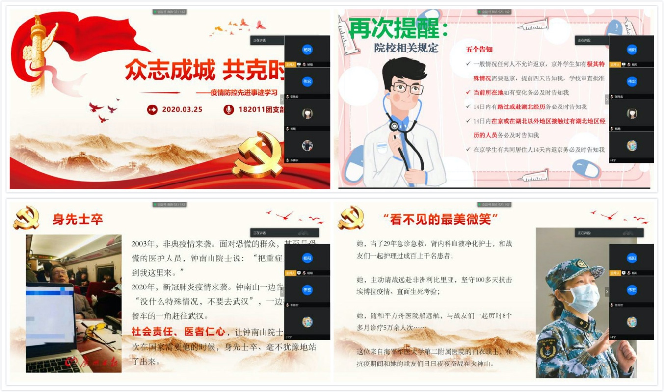 2018级本科生开展“无惧疫情,英雄在身边”主题活动。团支书介绍钟南山院士和火神山医院重症医学一科护士长陈静的事迹。同学们结合自身观察与体会进行了分享交流。本年级李智龙等同学也主动参与所在社区的志愿者工作,为防疫贡献了青春力量。活动倡议,继续坚持贯彻属地和院校防疫相关政策,提高警惕,牢记“五个告知”,坚持“四个务必”,不擅自返京返校,在家安排好学习和生活,保持良好心态,培养健康卫生习惯,及时打卡,共度难关。