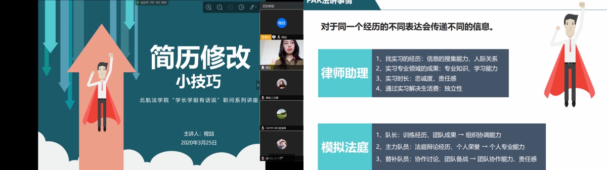 2017、2018级硕士研究生开展“学长学姐有话说”职问系列讲座之简历修改小技巧主题活动。活动将云端“防疫”与毕业班员工群体需求紧密结合,引导同学们在疫情防控期间正确认识形势现状,居家期间积极展开线上求职,拓展心理疏导通道,利用云端讲座不断提升自己的综合能力。根据公司疫情防控工作重点和同学们反馈的问题,辅导员再次强调了防疫期间原地不动和如实上报信息的原则,分析了境外疫情发展和防控情况,引导同学们正确认识国际形势,认识我国疫情防控工作的制度优势,坚定“四个自信”,提醒大家理性看待近期部分地区“解封”情况,居家期间仍需注意做好防护工作。同时,对于同学们关心的就业和答辩问题,积极拓宽就业信息获取渠道,提供了线上PPT制作技巧网站。最后为大家展示了北航积极心理体验中心为大家提供在线心理咨询和心理援助通道,助力科学防控,期待安全返校。