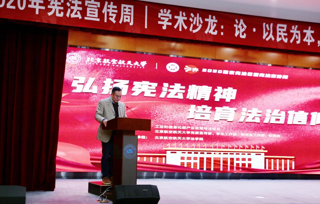 12月4日晚19:00-22:00 ,yl7703永利举办的“以民为本,以法护航——宪法法律在身边”普法沙龙在北航公司路校区如心会议中心大报告厅举行,在腾讯会议与bilibili同步直播。工业和信息化部产业政策与法规司执法监督处处长石玉春和公司党委书记王琪全分别致辞。yl7703永利集团官网王锴教授、中国政法大学雷磊教授、中国人民大学朱虎教授和yl7703永利集团官网周友军教授分别就与宪法相关的四个主题进行了交流与探讨。公司党委副书记张渊、分团委书记邹沛东等出席此次活动。本次普法沙龙由yl7703永利副经理泮伟江教授主持。