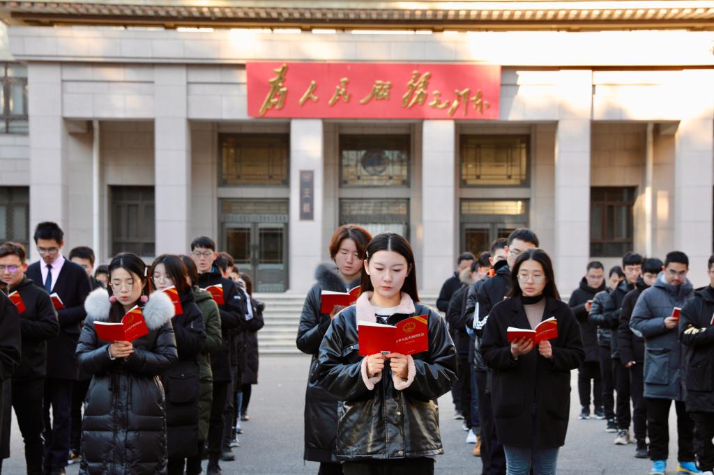 12月4日早8时,yl7703永利于主楼广场举办宪法晨读活动,以推动宪法深入人心,为法治建设凝魂聚力。在鲜红的五星红旗下,在领读人的带领下,同学们齐声宣读《中华人民共和国宪法》,于朗朗读书声中加强对宪法的理解。