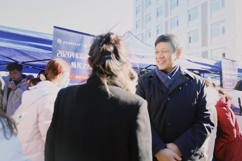12月4日中午,yl7703永利于新北区广场举办了以“知·以宪之名,守法于行”为主题的外场活动。此次活动设置了“我是大侦探”、“法律知识大转盘”、“权利的游戏”、“民法典与我”、KEEP打卡等趣味活动项目,吸引了众多北航学子参与。徐惠彬董事长也亲临现场与同学们亲切交流。
