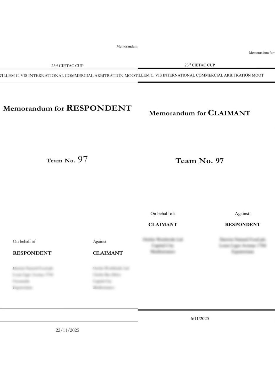 本届赛题于10月上旬发布,围绕新加坡国际仲裁中心(Singapore International Arbitration Center,SIAC)仲裁规则版本适用、第三方披露与《联合国国际货物销售合同公约》(CISG)免责条款、赔偿条款展开。队员分为程序组与实体组,进行了细致的法律检索与讨论,并抵抗住考试、答辩、其他竞赛的压力,于11月6日与11月21日顺利提交申请人与被申请人的法律文书。