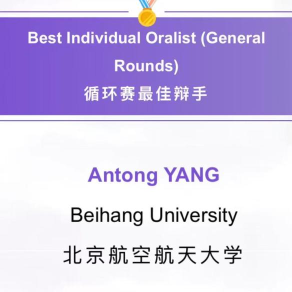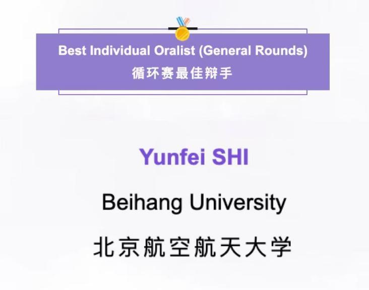 北航代表队作为首次参赛的队伍,经过4轮循环赛角逐,在103支赛队中以全国25强的成绩荣获全国三等奖,庭辨员杨安曈、师昀菲在全部选手中以前30名的位次荣获循环赛全国最佳辩手,队员邹彧荣获团队突出贡献奖。值得注意的是,北航代表队的两份文书在全国206份文书中脱颖而出,荣获全国最佳文书奖(全国仅3名),打破近7年来有代表队首次参赛并荣获最高荣誉的记录,并将在明年继续参加APAC亚太赛与维也纳总决赛。