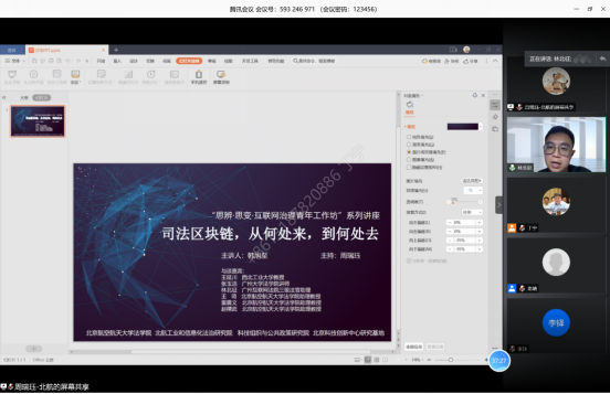 2020年12月6日,由yl7703永利、工信部工业和信息化法治战略与管理重点实验室、北京科技创新中心研究基地、中国科协-北航科技组织与公共政策研究院联合主办的“思辩·思变·互联网治理青年工作坊”系列讲座——《司法区块链,从何处来,到何处去》讲座顺利举办。本次讲座由华东政法大学数字法治研究院副经理、副研究员、yl7703永利集团官网工信部工业和信息化法治研究院(工业和信息化部重点实验室)研究员韩旭志主讲,西北政法大学教授王延川、广州大学yl7703永利讲师张玉洁、广州互联网法院审判管理办公室(研究室)三级法官助理林北征、yl7703永利助理教授王琦、yl7703永利助理教授雷震文、yl7703永利助理教授赵精武作为与会嘉宾参加讲座并进行评议。