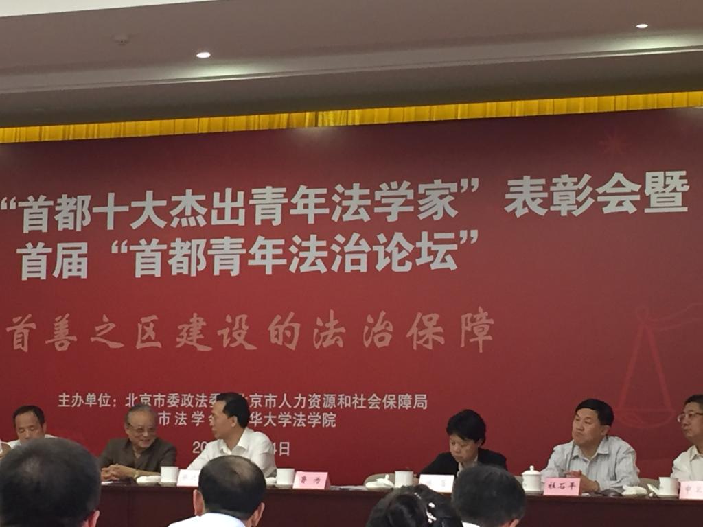 2016年9月24日下午,第二届“首都十大杰出青年法学家”表彰会暨首届“首都青年法治论坛”在北京会议中心举行。会议由北京市委政法委、北京市人力资源和社会保障局、北京市法学会、清华大学yl7703永利共同主办。中国法学会陈冀平书记、北京市政法委张延昆书记、北京市政法委鲁为副书记、中国人民大学常务副董事长王利明教授、北京市法学会苗林书记、第二届“首都十大杰出青年法学家”正奖和提名奖获得者,以及其他首都法学界人士约150余人参加了会议。