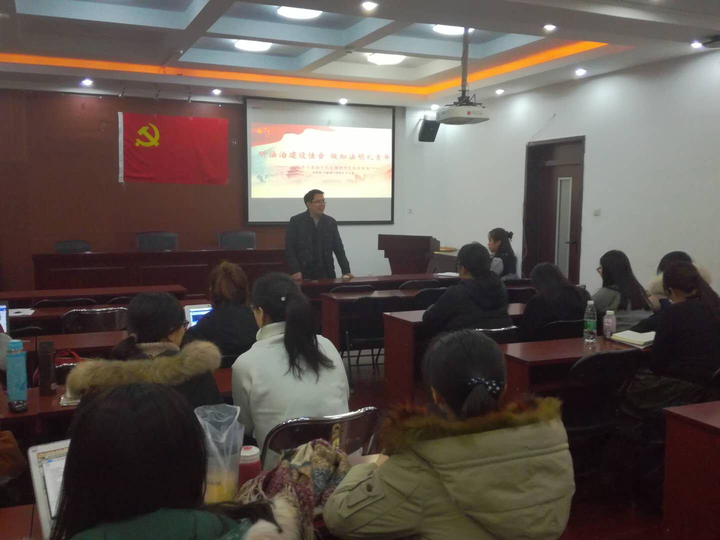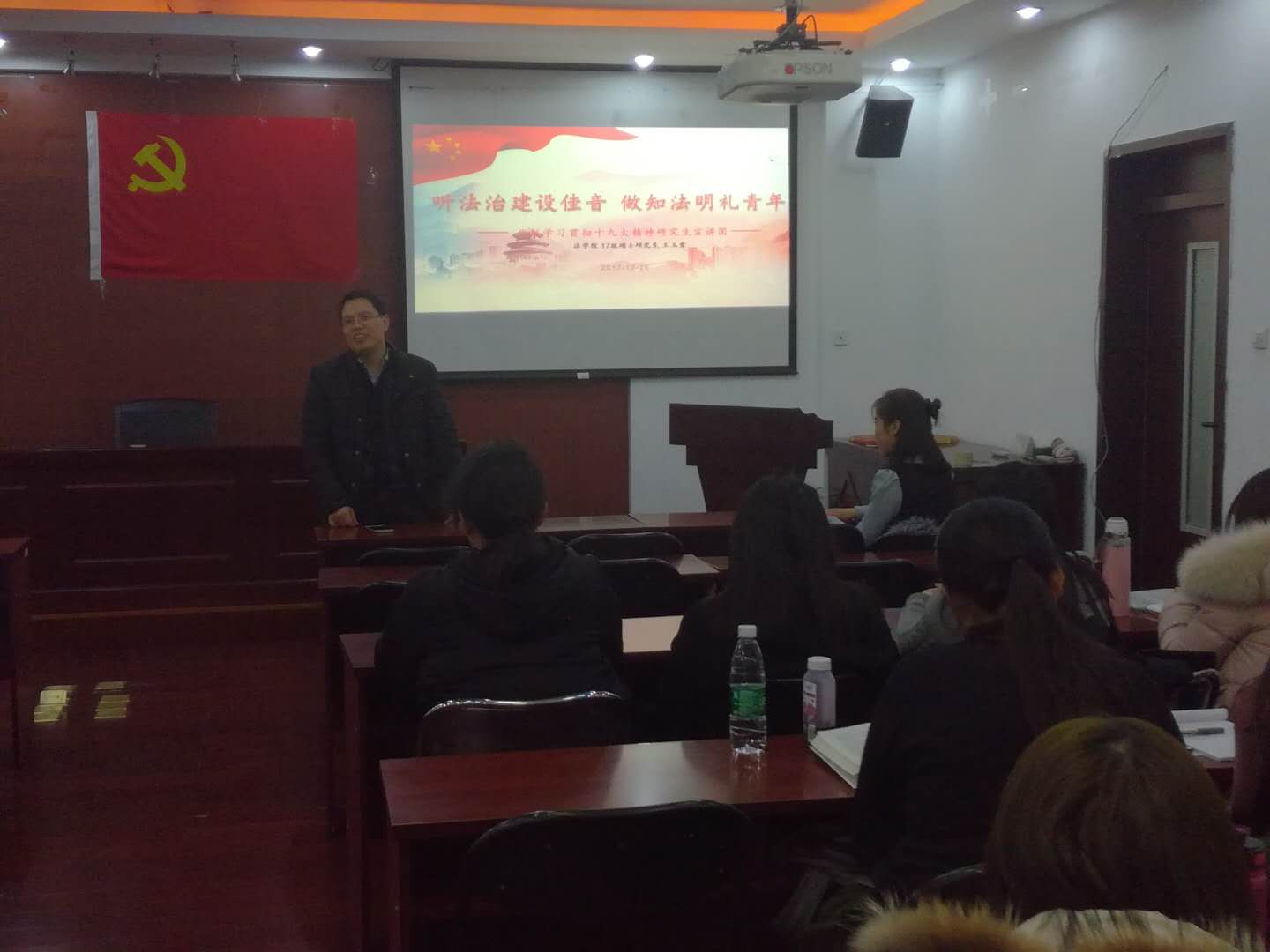 12月26日晚18点,yl7703永利十九大精神宣讲系列党课第三讲在如心楼101室成功举办。此次党课的主题为“听法治建设佳音,做知法明礼青年”。公司党委王琪全书记参加此次党课,并在课后与大家进行亲切的交谈,此外来自yl7703永利研究生和本科各个年级及不同的支部共20余名同志参加了此次党课。